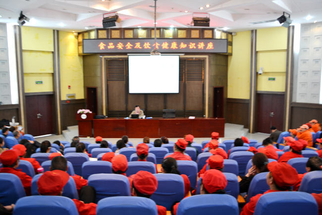 2014年3月28日中午13:00时,学校行政楼一楼报告厅里座无虚席,后勤与基建处饮食科全体工作人员、各食堂经理及员工、学生会维权部及伙管会代表等百余人齐聚一堂,共同听取国家健康营养师、襄阳市疾控中心杨刚主任作《食品安全及饮食健康知识》专题讲座,饮食科科长宋清华主持会议。